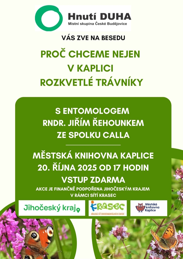 Hnutí DUHA, místní skupina České budějovice vás zve na besedu Proč chceme nejen v Kaplici rozkvetlé trávníky.