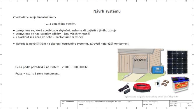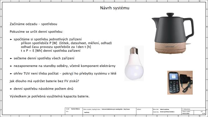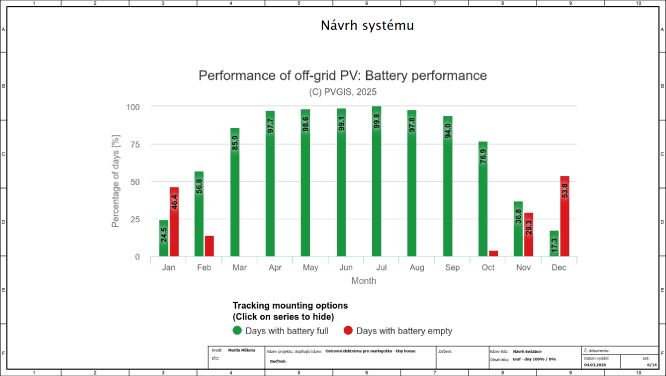 To praktické, co potřebujeme vědět je, že panely dokážou vyrobit stejnosměrný proud a napětí. Vyrábí ho podle toho jak svítí, významně rozdílně v létě a v zimě. Podstatné je jejich množství (nominální výkon), sklon a orientace ke světovým stranám. K detailnímu popisu zákonitostí zapojení se snad někdy dostanu v jiném článku. Pokud jde o celkový výkon potřebný pro vaši instalaci, o tom ještě bude řeč níže. Jak vidíte z obrázku, panely jsou jen špička ledovce celého systému. A na závěr ještě odpověď na jednu častou otázku. Co se stane s elektřinou, když je baterie už nabitá a energii není kam dávat? V tuto chvíli regulátor zastaví nabíjení. Proud, který do teď tekl z panelů do baterie se zastaví a napětí na panelech mírně vzroste. Energie, ze které by panel vyrobil elektřinu, zůstane v podobě tepla, takže je povrch panelu o něco teplejší. Tím je učiněno za dost zákonu o zachování energie.
