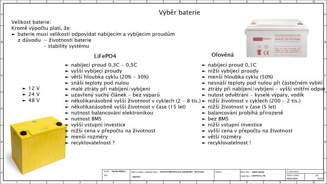 Jak již bylo řečeno, baterie je základ DC couplingu. O druzích bateriií ještě bude řeč. Obvykle používaná napětí baterií v ostrovních systémech jsou 12 V, 24 V a 48 V (výjimečně 36V a 96V). Protože elektrický výkon je součinem proudu a napětí, platí, že čím vyšší napětí má baterie, tím menší proud potřebujeme pro přenesení stejného výkonu. Pro stejný výkon bude proud v 12 V systému čtyřnásobný oproti 48 V systému. To je velmi důležité, protože větší proud znamená také větší ztráty, větší průřezy vodičů. Obvykle tedy 12V systémy používáme tam, kde nám stačí malé výkony a kde se to hodí z praktických důvodů - např. v karavanu, kde lze dobře propojit palubní a startovací baterii, kde máme světla a další zařízení na 12 V a kde potřebujeme jen malý, nebo žádný střídač. Také tam, kde máme jeden malý FV panýlek o napětí kolem 30 - 40 V, který může jen těžko napájet 48V baterii. U výkonů nad 2000 W už dává prakticky vždy smysl 48 V systém. 24 V je střední cesta, která má smysl jen ve specifických případech.